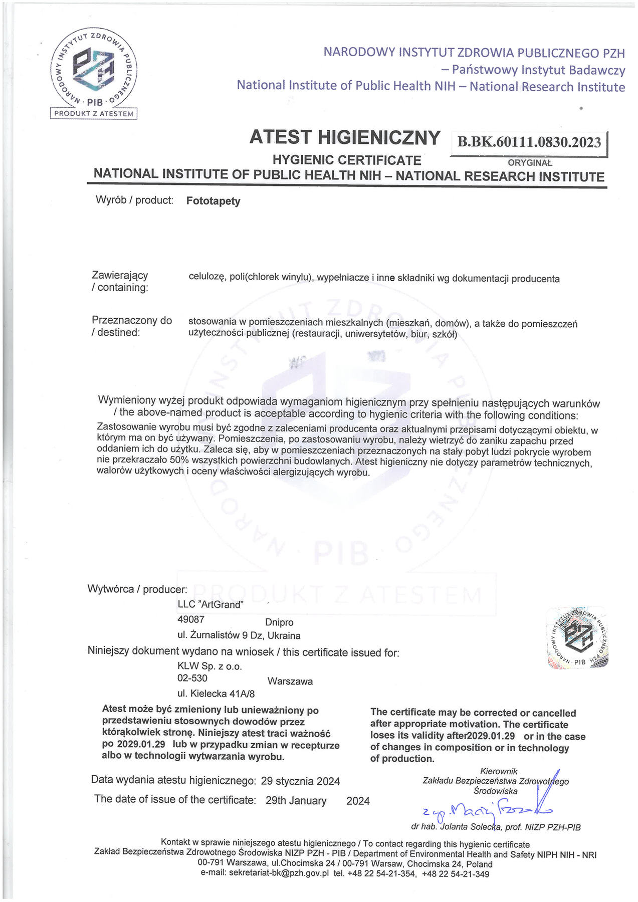 La obtención de un certificado higiénico por parte de KLW Sp z o.o. demuestra la calidad y seguridad de nuestros productos. Cumplimos con todos los requisitos para la producción de papeles pintados para que nuestros clientes puedan estar tranquilos y seguros de la seguridad de los materiales utilizados.