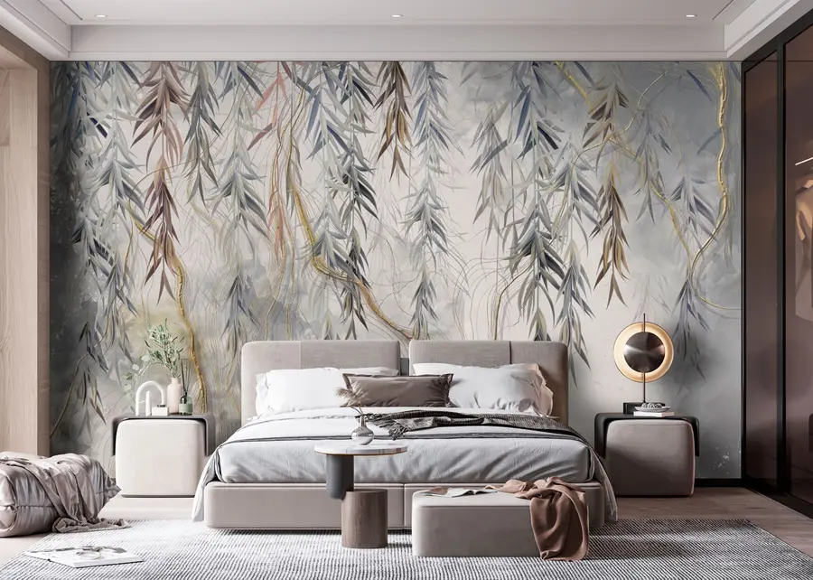 - en habitaciones espaciosas, las personas pueden sentirse incómodas, el fotomural en colores oscuros o con patrones horizontales ayudará a solucionar esto. También puedes comprar papeles pintados en el dormitorio con estampados grandes, por ejemplo, árboles, flores grandes, etc.;