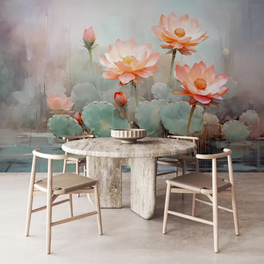Delicadas flores rosas y moradas de imitación acuarela con pétalos suaves y difuminados sobre un fondo azul salpicado