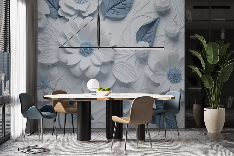 Papel pintado minimalista siluetas de grandes hojas amarillas veteadas sobre fondo azul