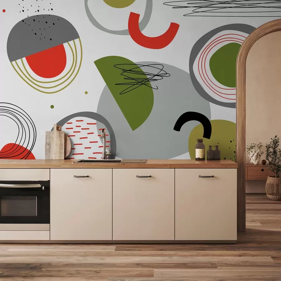 Abstracción de formas geométricas y líneas, color verde, gris, rojo