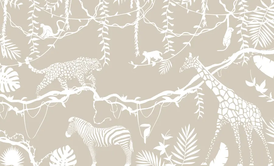 Arte abstracto de la selva, lianas, leopardo, jirafa, monos, palmeras, monstera, beige y blanco