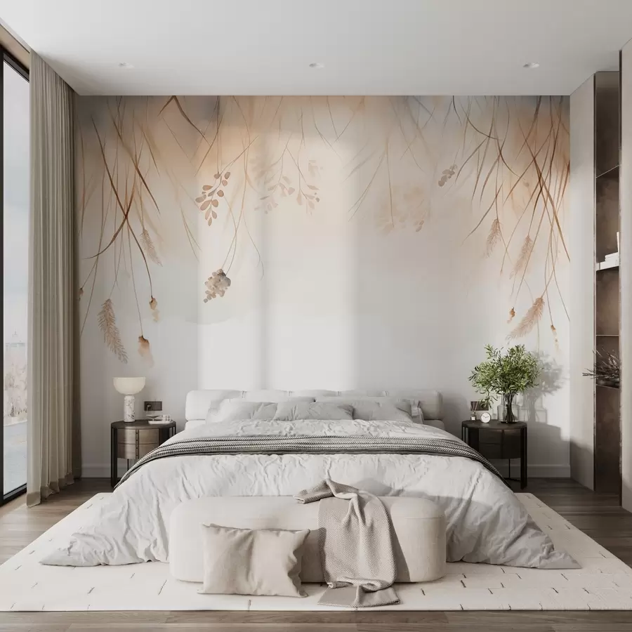 Hierba y maleza con hojas y tallos finos, colores verde claro y marrón, pinceladas suaves y delicadas, estampado minimalista