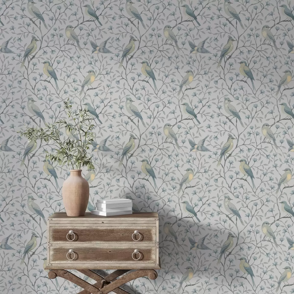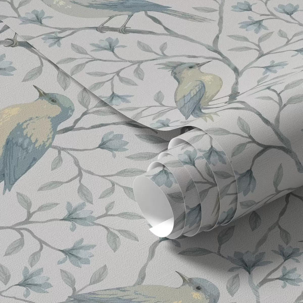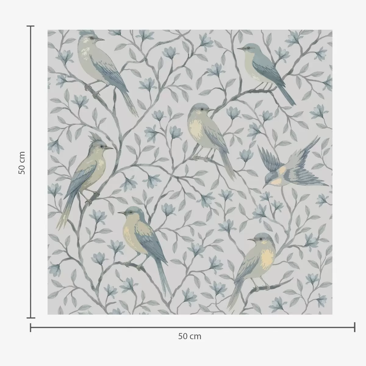 Papel pintado Pájaros en las ramas, esquema gris azulado a00782