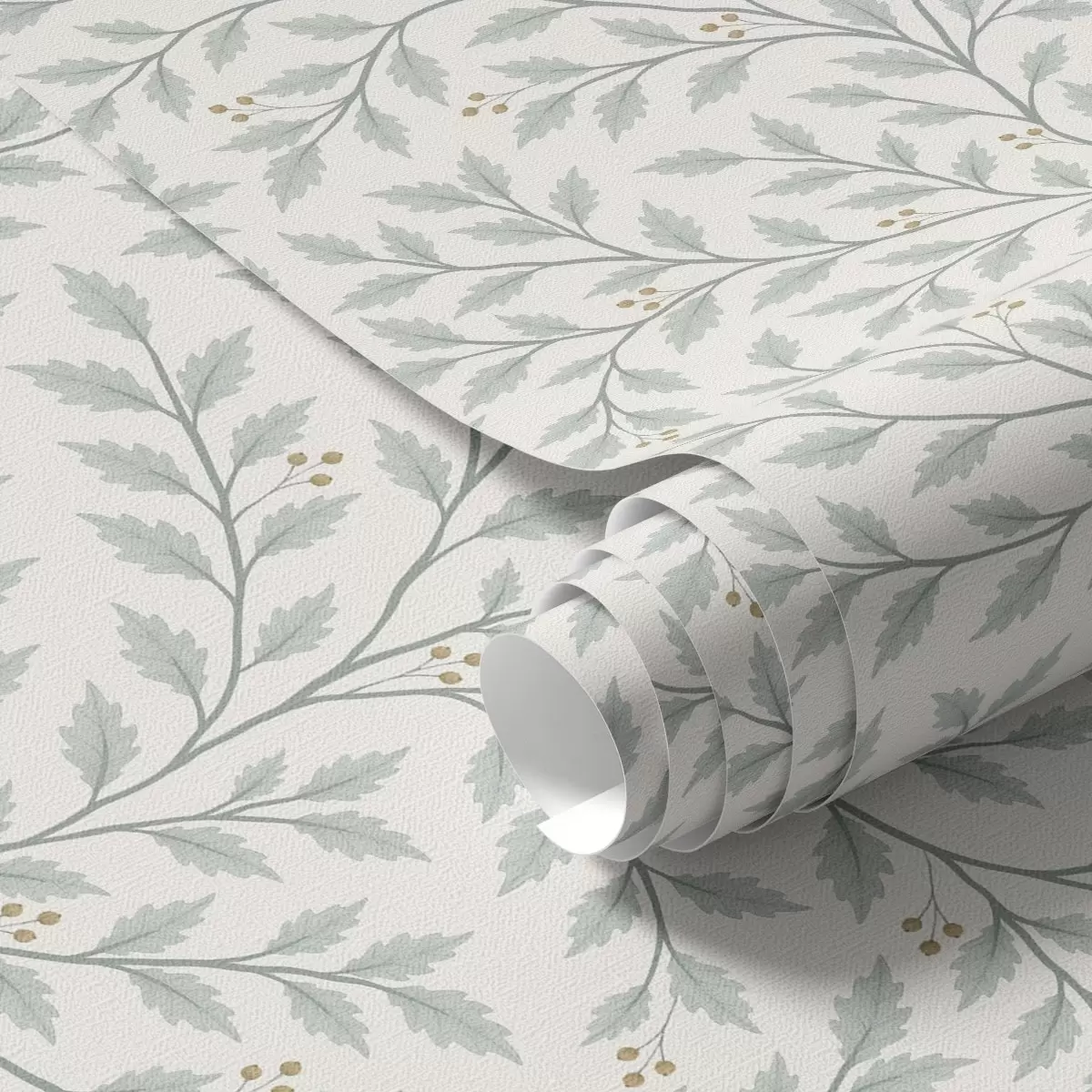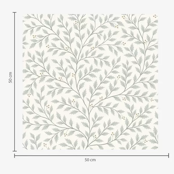 Papel tapiz Ramitas con hojas y bayas, crema clara y salvia. Nr. a00783