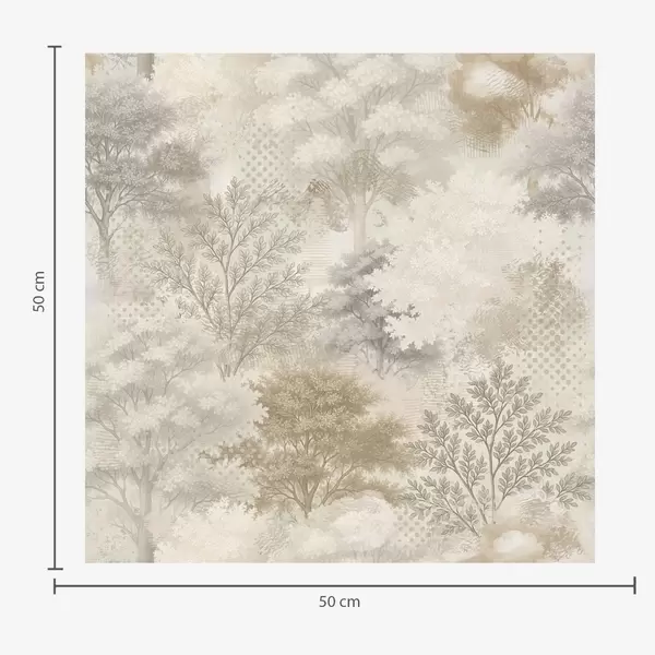 Papel tapiz Bosque apacible envuelto en niebla, suaves tonos beige y grisáceos. Nr. a00785