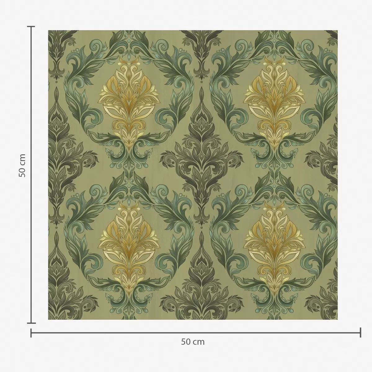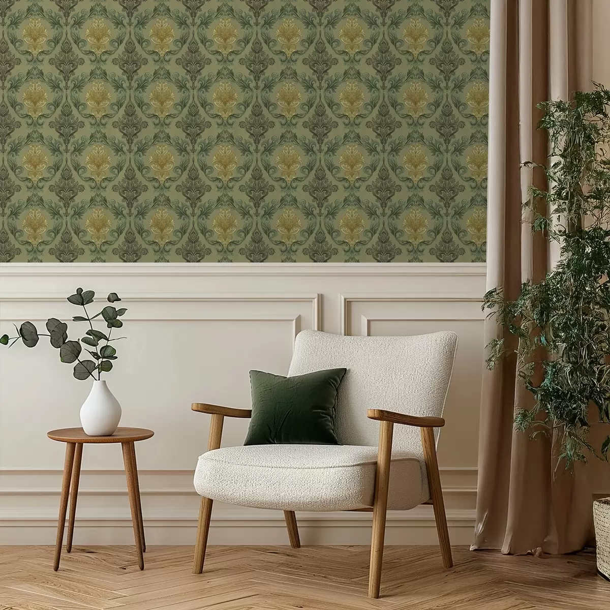 Papel tapiz Damasco con volutas vegetales, paleta de colores oliva y ocre. Nr. a00828