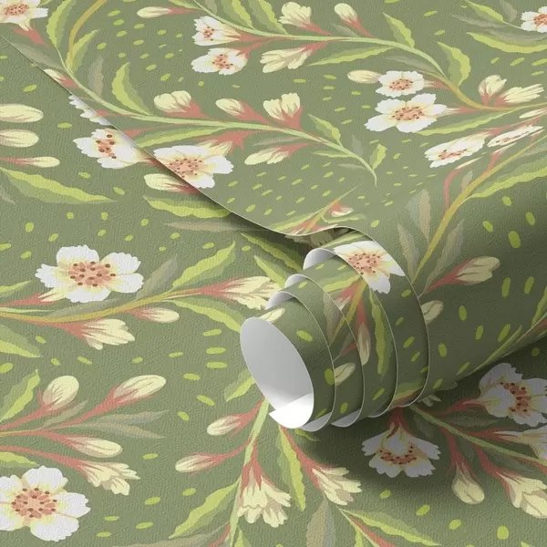 Papel pintado Ramas con flores color crema sobre fondo oliva. a00850