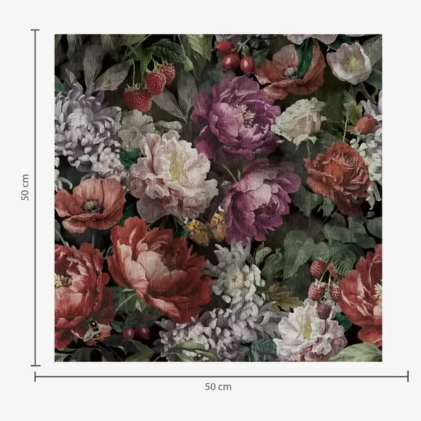 Fotomurales Peonías oscuras y dramáticas, bayas y mariposa sobre fondo negro. Nr. a00862