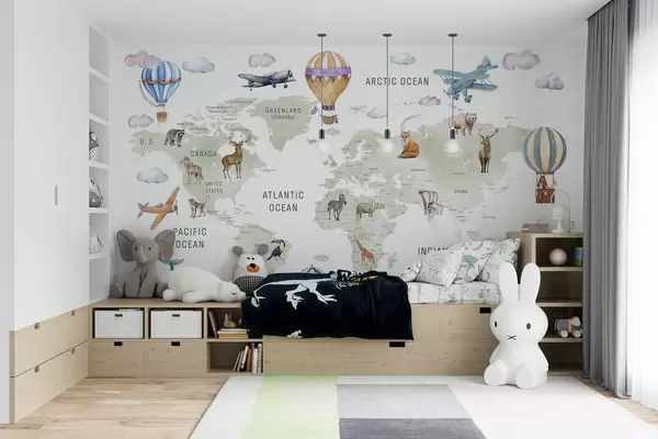 Fotomurales Mapa infantil en estilo acuarela con animales y globos aerostáticos. En inglés. Color verde. Nr. c00001en