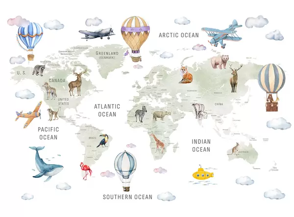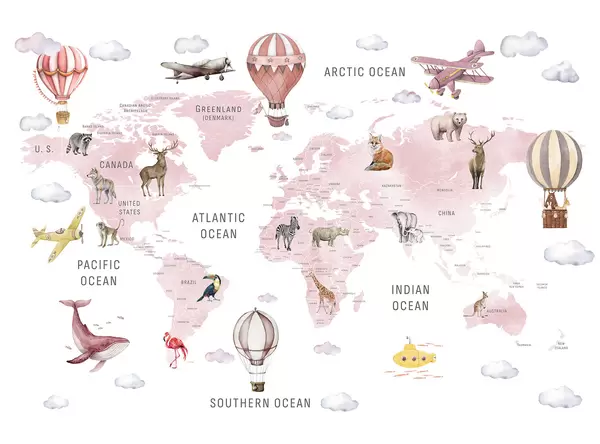 Fotomurales Mapa infantil en estilo acuarela con animales y globos aerostáticos. En inglés. Color rosa. Nr. c00001env3