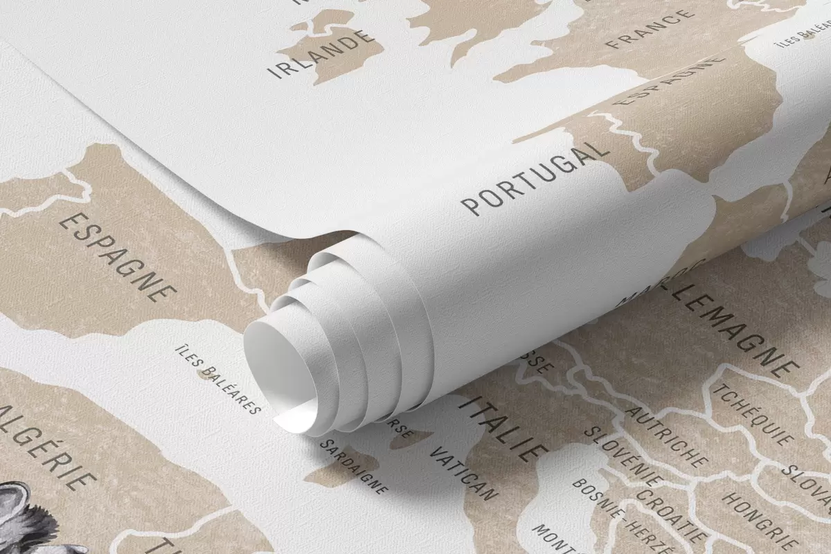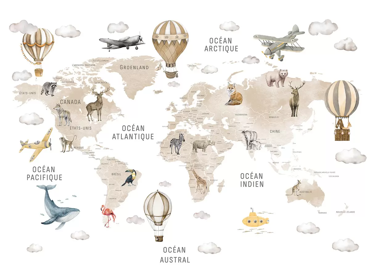Fotomurales Mapa infantil en estilo acuarela con animales y globos aerostáticos. Idioma francés. Color beige. Nr. c00001frv2