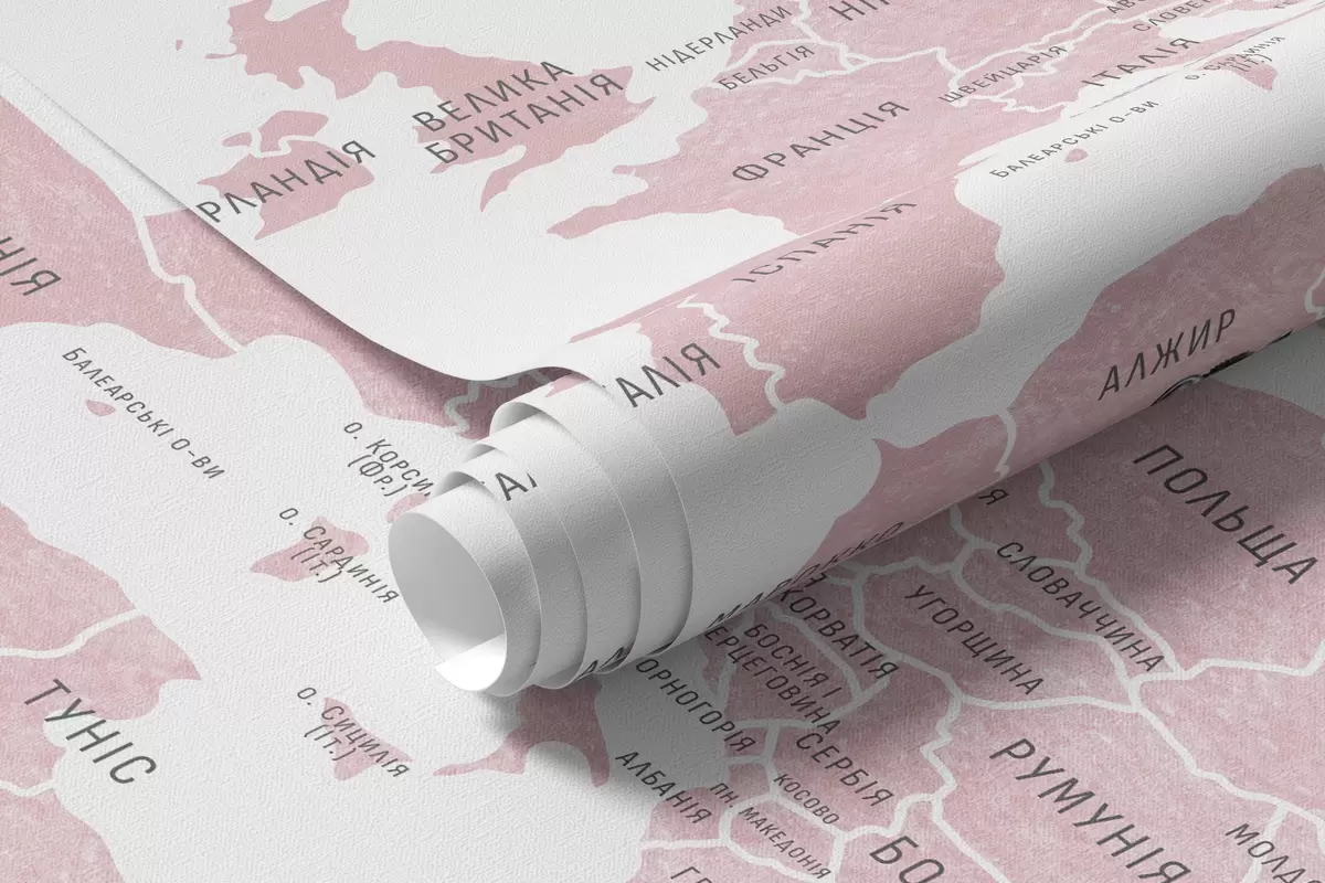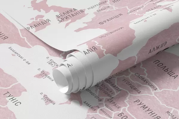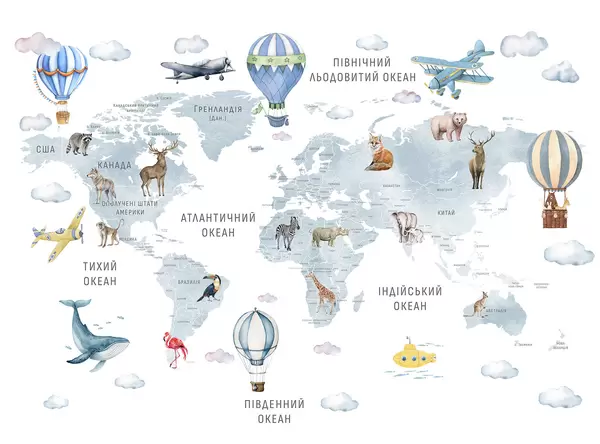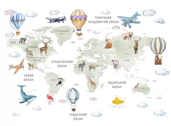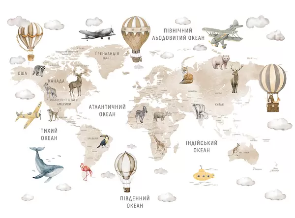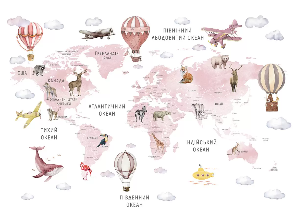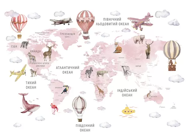 Fotomurales Mapa infantil en estilo acuarela con animales y globos aerostáticos. Idioma ucraniano. Color rosa. Nr. c00001ukv3