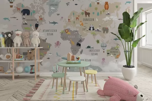 Fotomurales Mapa mundial infantil con animales y globos aerostáticos. Idioma alemán. Nr. c00002de