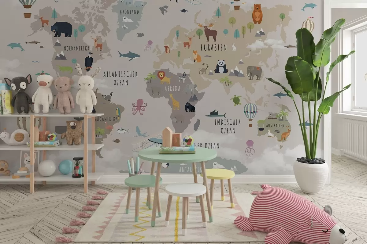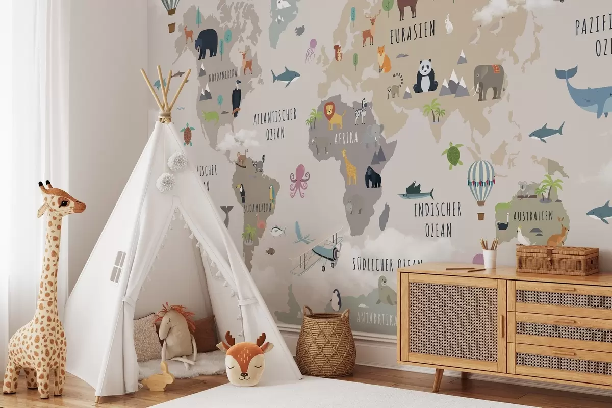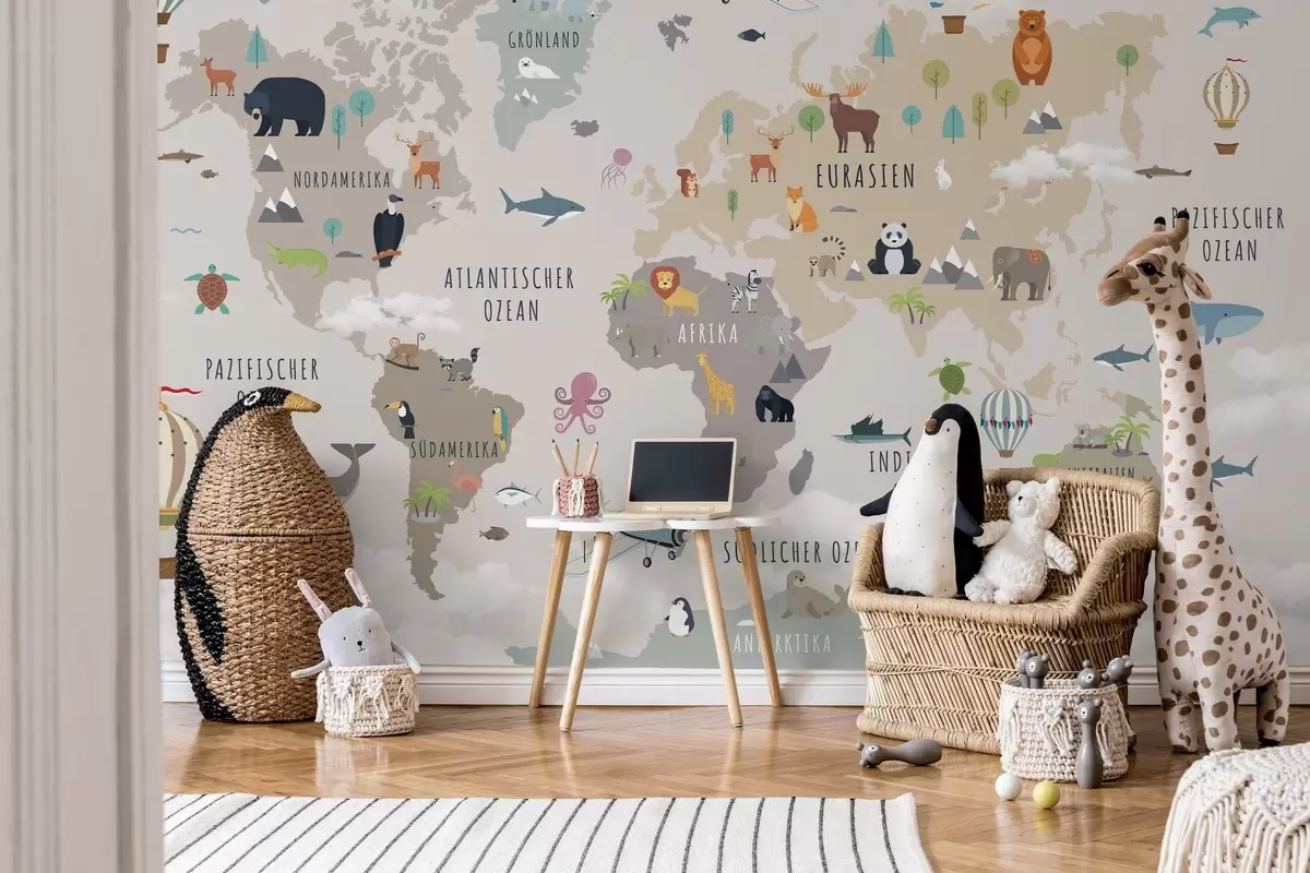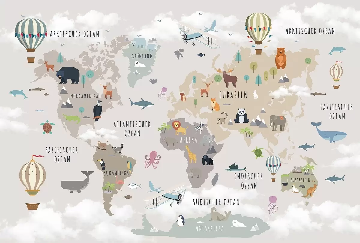 Fotomurales Mapa mundial infantil con animales y globos aerostáticos. Idioma alemán Nr. c00002de
