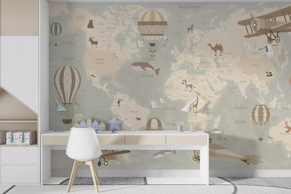 Fotomurales Mapa mundial infantil con animales, aviones y globos aerostáticos. En inglés. Color beige. Nr. c00003en