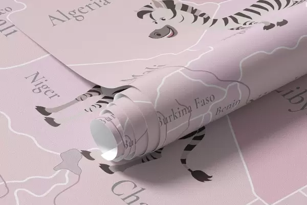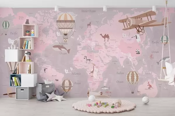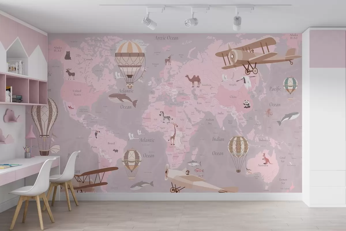 Fotomurales Mapa mundial infantil con animales, aviones y globos aerostáticos. En inglés. Color rosa. Nr. c00003env3