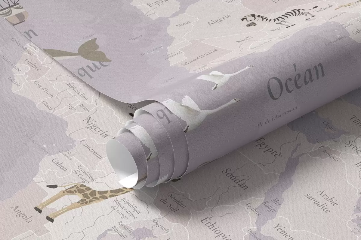 Fotomurales Mapa mundial infantil con animales, aviones y globos aerostáticos. Idioma francés. Color morado. Nr. c00003frv4