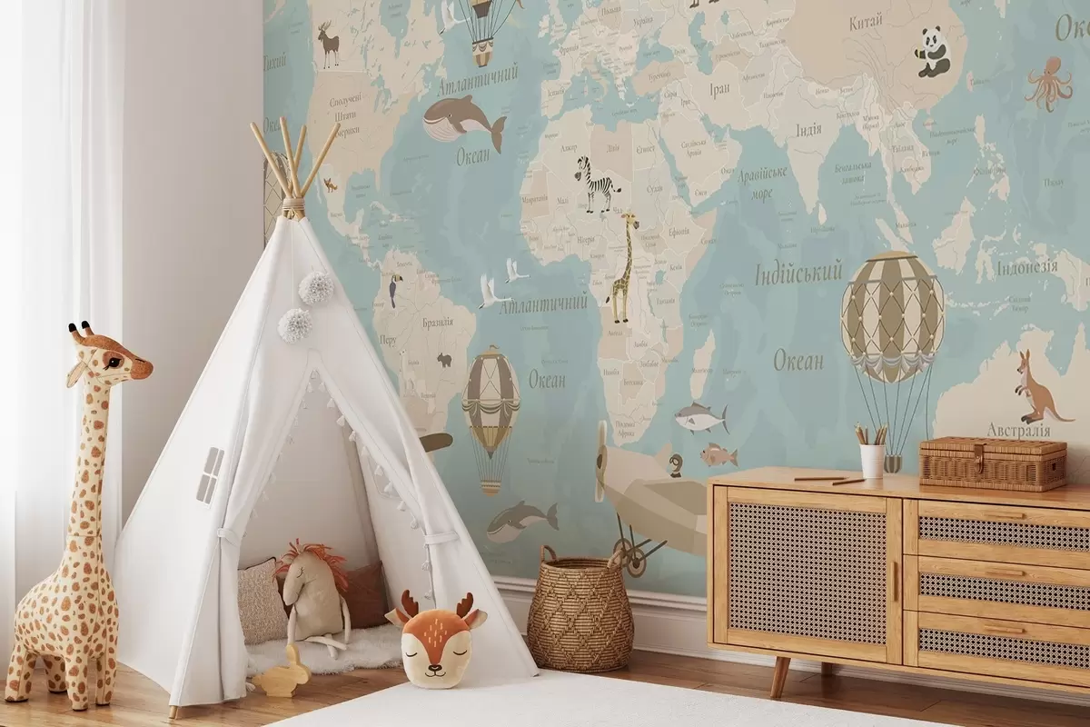 Fotomurales Mapa mundial infantil con animales, aviones y globos aerostáticos. Idioma ucraniano. Color azul. Nr. c00003ukv1
