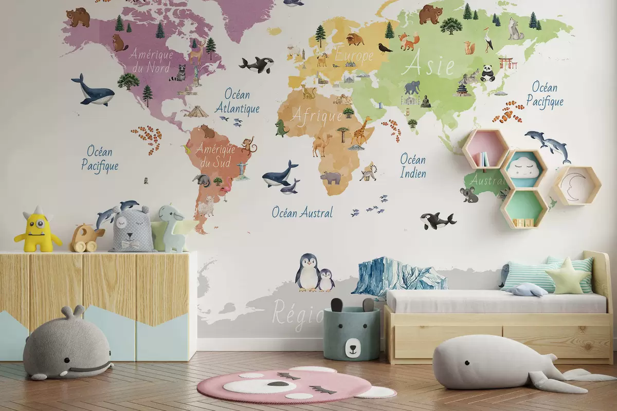Fotomurales Un mapa a color con estilo de acuarela en el que aparecen animales, plantas y elementos arquitectónicos. Etiquetas en francés Nr. c00009fr