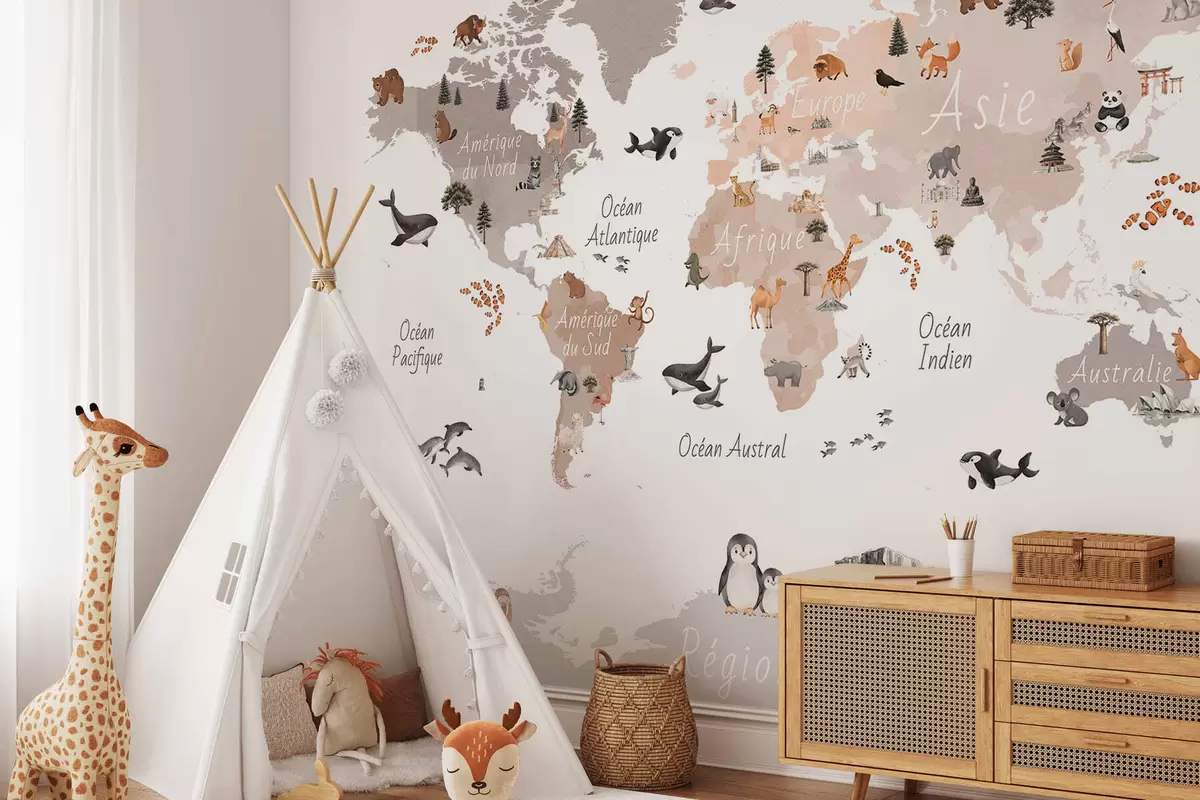 Fotomurales Un mapa en tonos beige, con un estilo de acuarela, en el que aparecen animales, plantas y elementos arquitectónicos. Rótulos en francés Nr. c00009frv3