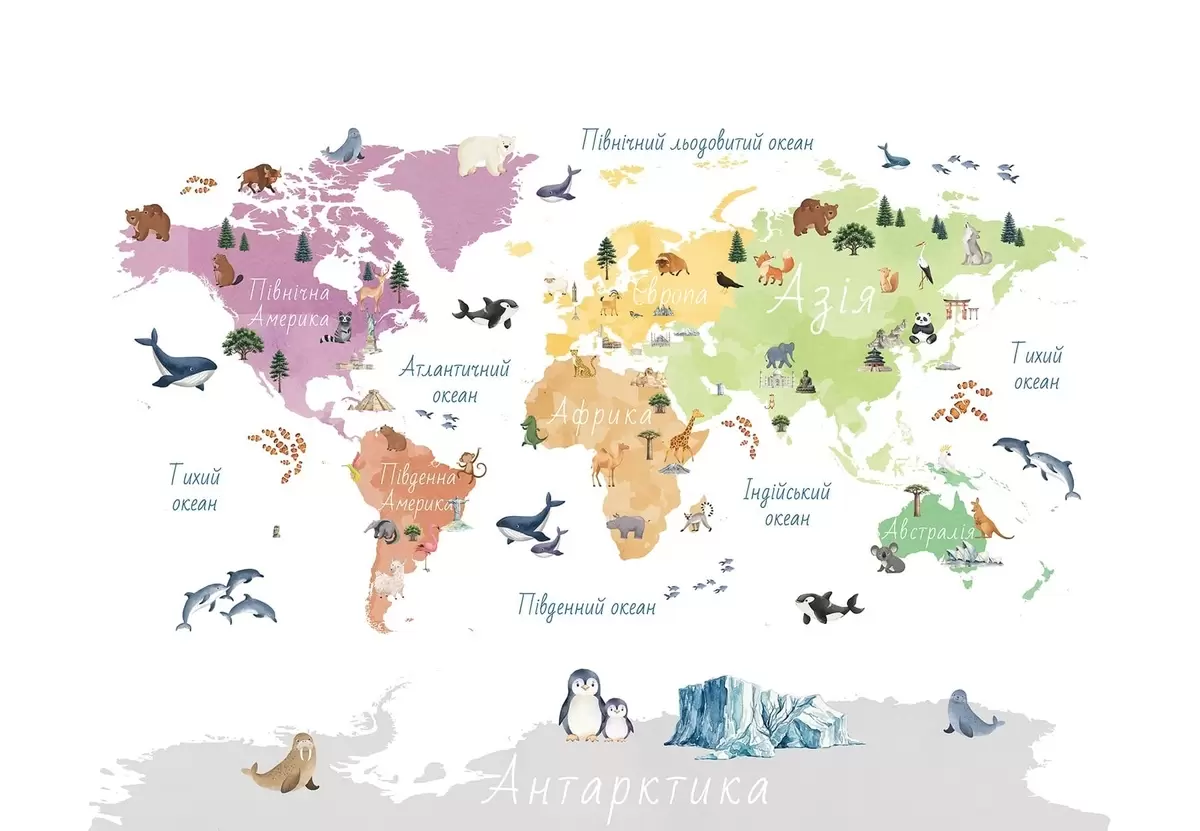 Fotomurales Un mapa a color con estilo de acuarela en el que aparecen animales, plantas y elementos arquitectónicos. Etiquetas en ucraniano Nr. c00009uk