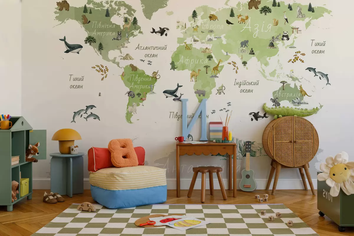 Fotomurales Un mapa de Green en estilo acuarela con animales, plantas y arquitectura. Etiquetas en ucraniano Nr. c00009ukv2