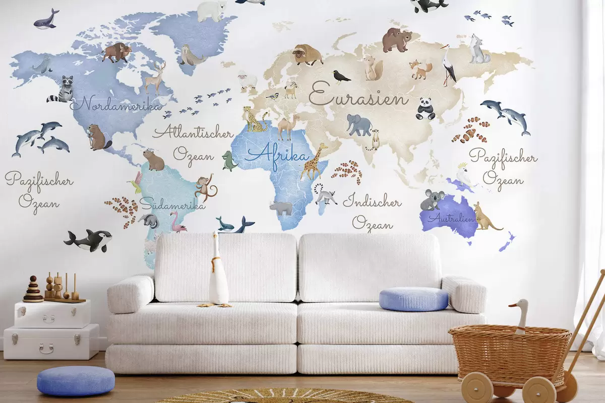 Fotomurales Un mapa azul de estilo acuarela con animales. Etiquetas en alemán Nr. c00012dev1