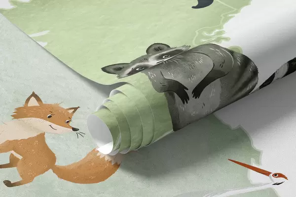 Fotomurales Un mapa verde con estilo de acuarela en el que aparecen animales. Etiquetas en español Nr. c00012esv2