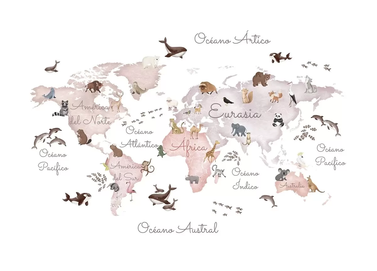 Fotomurales Un mapa en tonos beige, con un estilo de acuarela, en el que aparecen animales. Rótulos en español Nr. c00012esv3