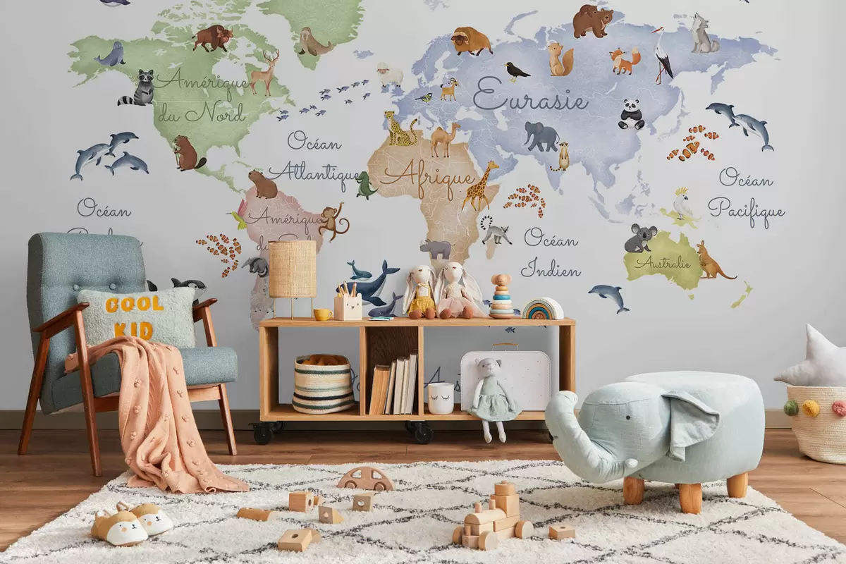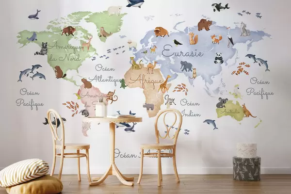 Fotomurales Un mapa a color con estilo de acuarela en el que aparecen animales. Etiquetas en francés Nr. c00012fr