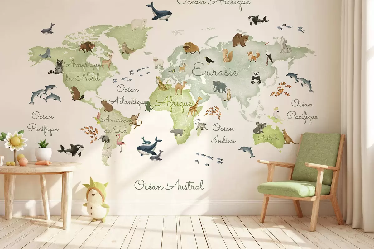 Fotomurales Un mapa verde de estilo acuarela con animales. Etiquetas en francés Nr. c00012frv2