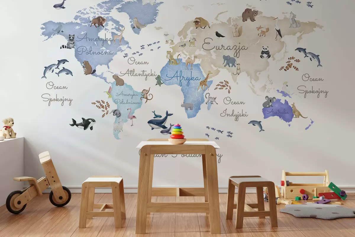 Fotomurales Un mapa azul con estilo de acuarela en el que aparecen animales. Etiquetas en polaco Nr. c00012plv1