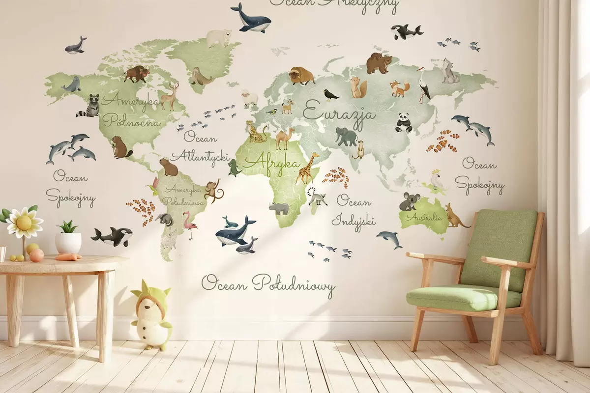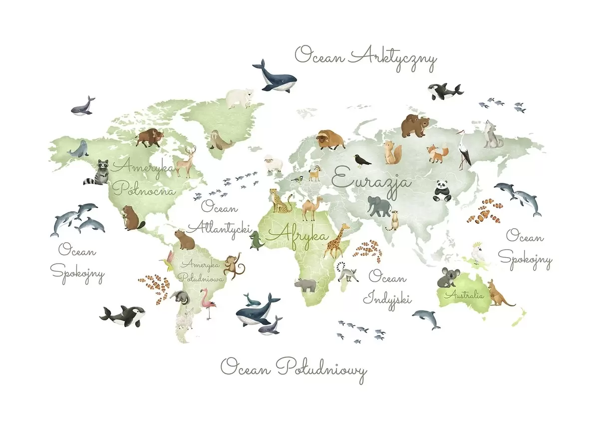 Fotomurales Un mapa verde con estilo de acuarela en el que aparecen animales. Rótulos en polaco Nr. c00012plv2