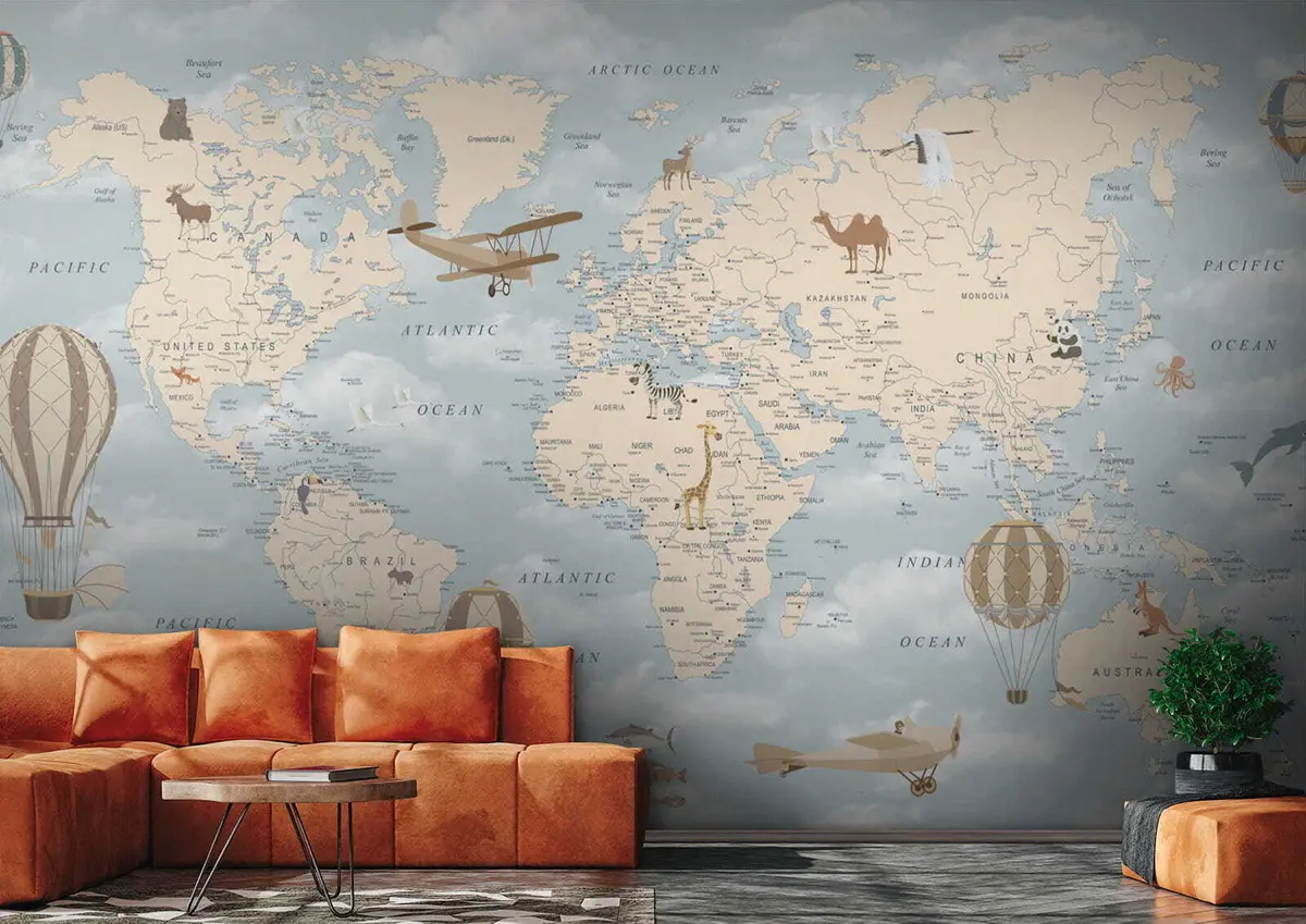 Fotomurales Mapa infantil del mundo con aviones. Nr. u60135
