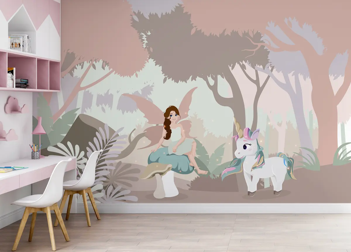 Fotomurales Princesa con unicornio en bosque rosa Nr. u95038