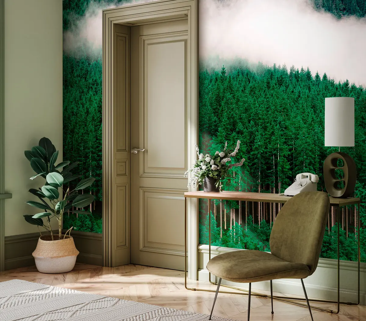 Fotomurales Bosque denso verde con pinos altos y niebla Nr. u95106