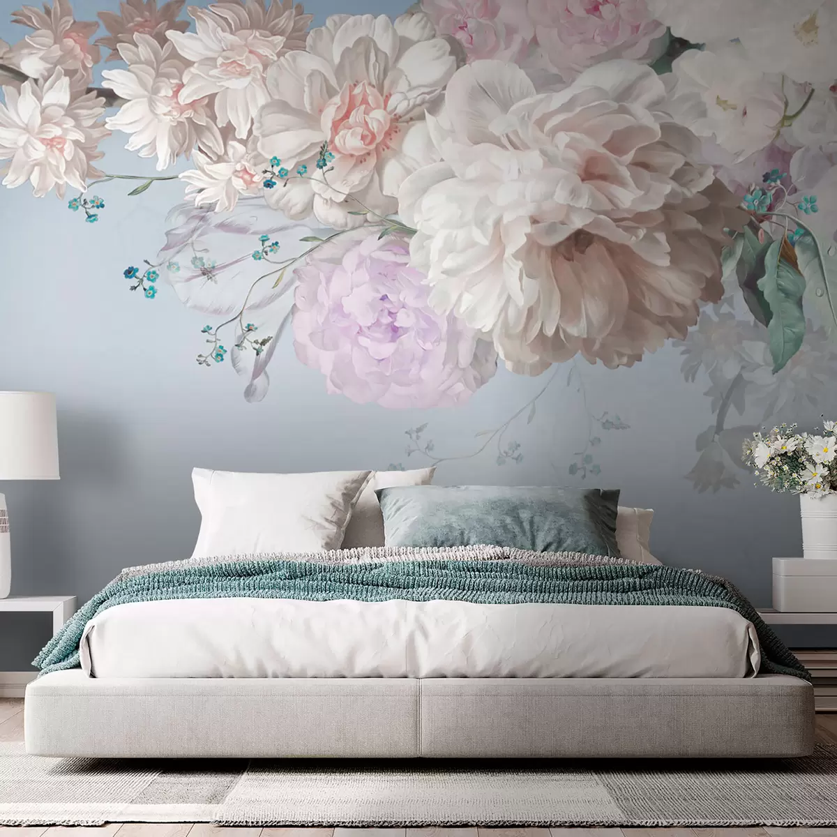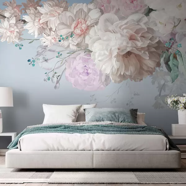 Fotomurales Grandes flores exuberantes, peonías blancas sobre un fondo azul. Nr. u95437