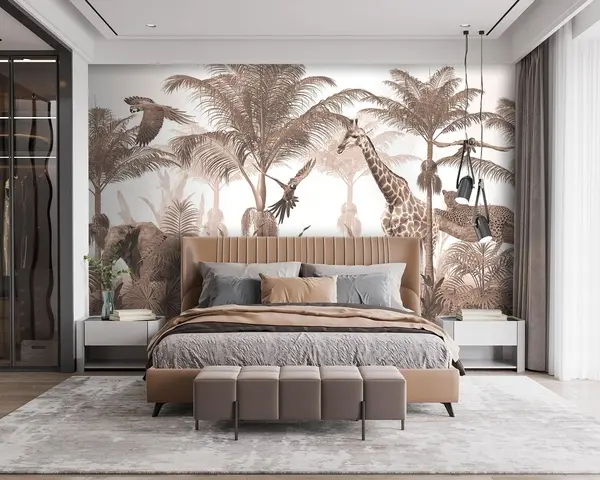 Fotomurales Diseño de papel tapiz de árboles tropicales con animales. Nr. u95906