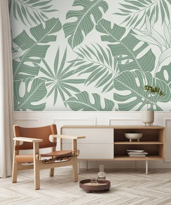 Fotomurales Hojas de palma Monstera en un mínimo de verde pálido. Nr. u96909