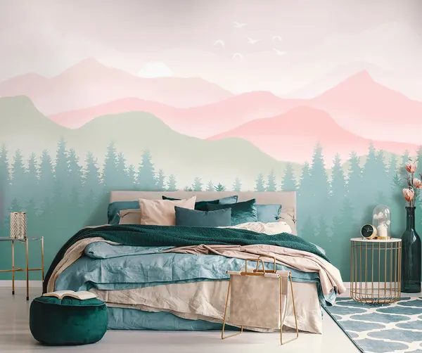 Fotomurales Montañas neblinosas con bosque de pinos, colores naturales suaves, rosa y verde Nr. u98774