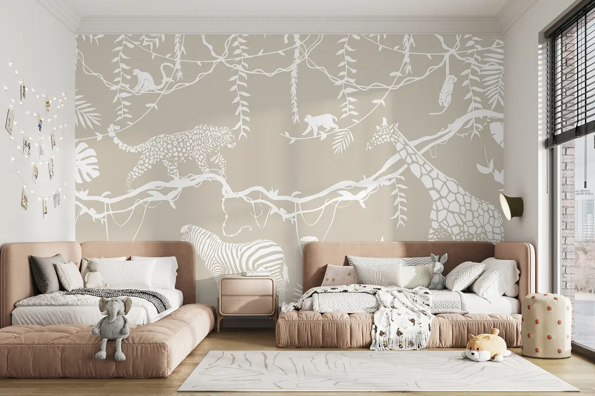 Fotomurales Arte abstracto de la selva, lianas, leopardo, jirafa, monos, palmeras, monstera, beige y blanco Nr. w00087