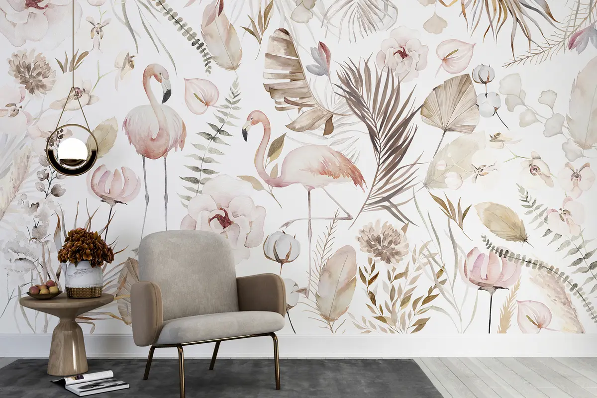Fotomurales Acuarela estilo boho, flamencos, hojas tropicales, algodón, orquídeas, peonías, rosas y beige. Nr. w00507