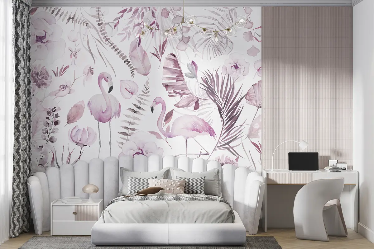 Fotomurales Arte acuarela estilo boho, flamencos, hojas tropicales, algodón, orquídea, peonía, color rosa Nr. w00507v2