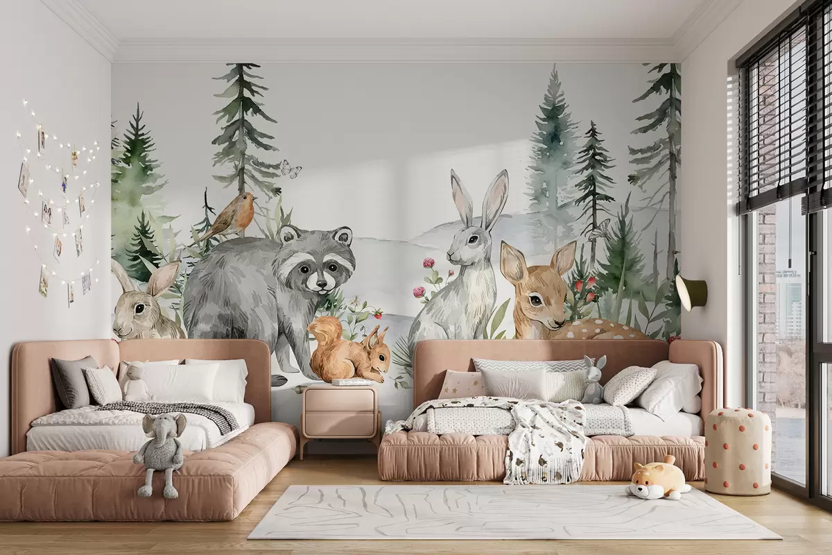 Fotomurales Un grupo de animales del bosque en un entorno boscoso con pinos. Nr. w00704