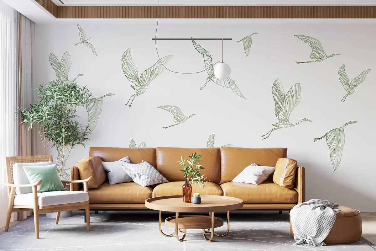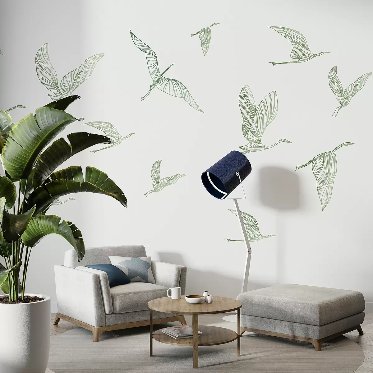 Fotomurales Arte lineal de pájaros voladores, minimalismo, naturaleza, colores verdes. Nr. w00758v2