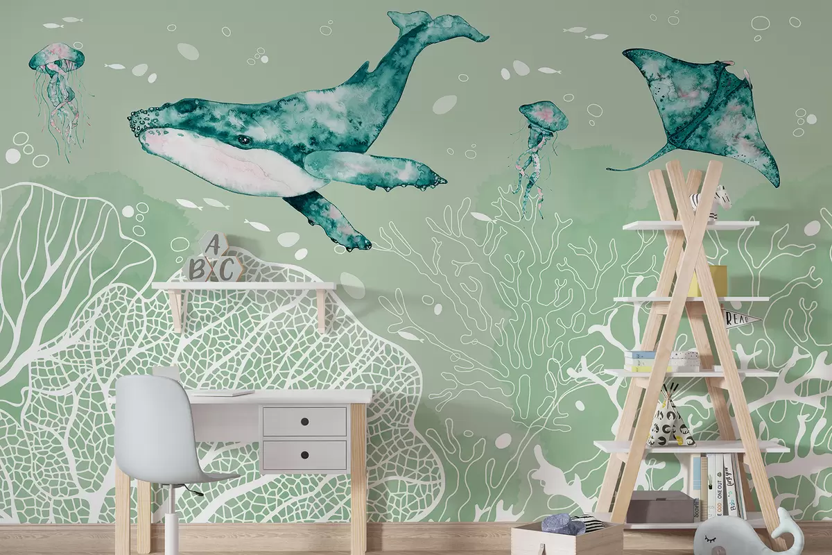 Fotomurales Ballena en el mar, acuarela, corales, medusas, vida marina, colores verdes. Nr. w00848v3