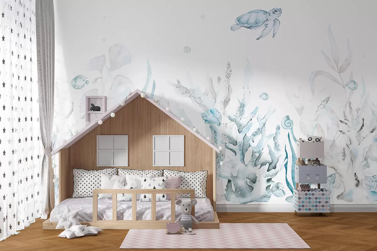 Fotomurales Corales marinos acuarela, conchas marinas, tortugas, vida marina, colores azules suaves Nr. w00849