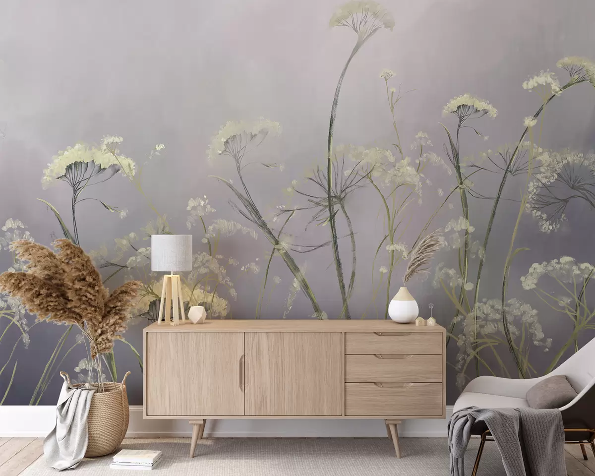 Fotomurales Flores silvestres blancas en un campo brumoso con un fondo gris suave y borroso Nr. w00903