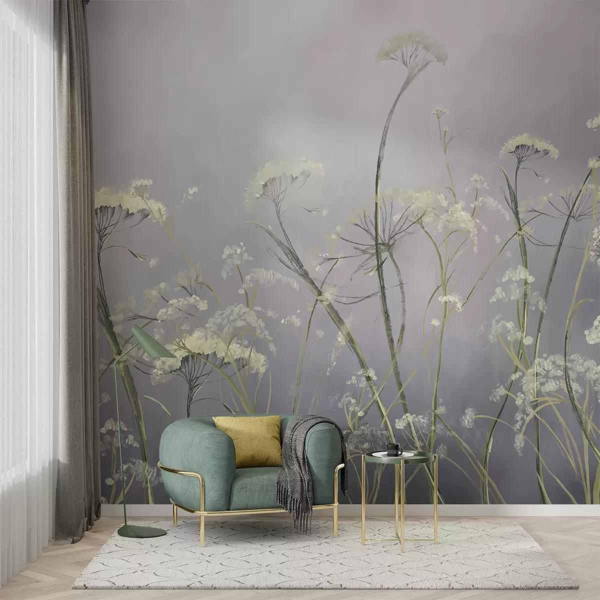Fotomurales Flores silvestres blancas en un campo brumoso con un fondo gris suave y borroso Nr. w00903